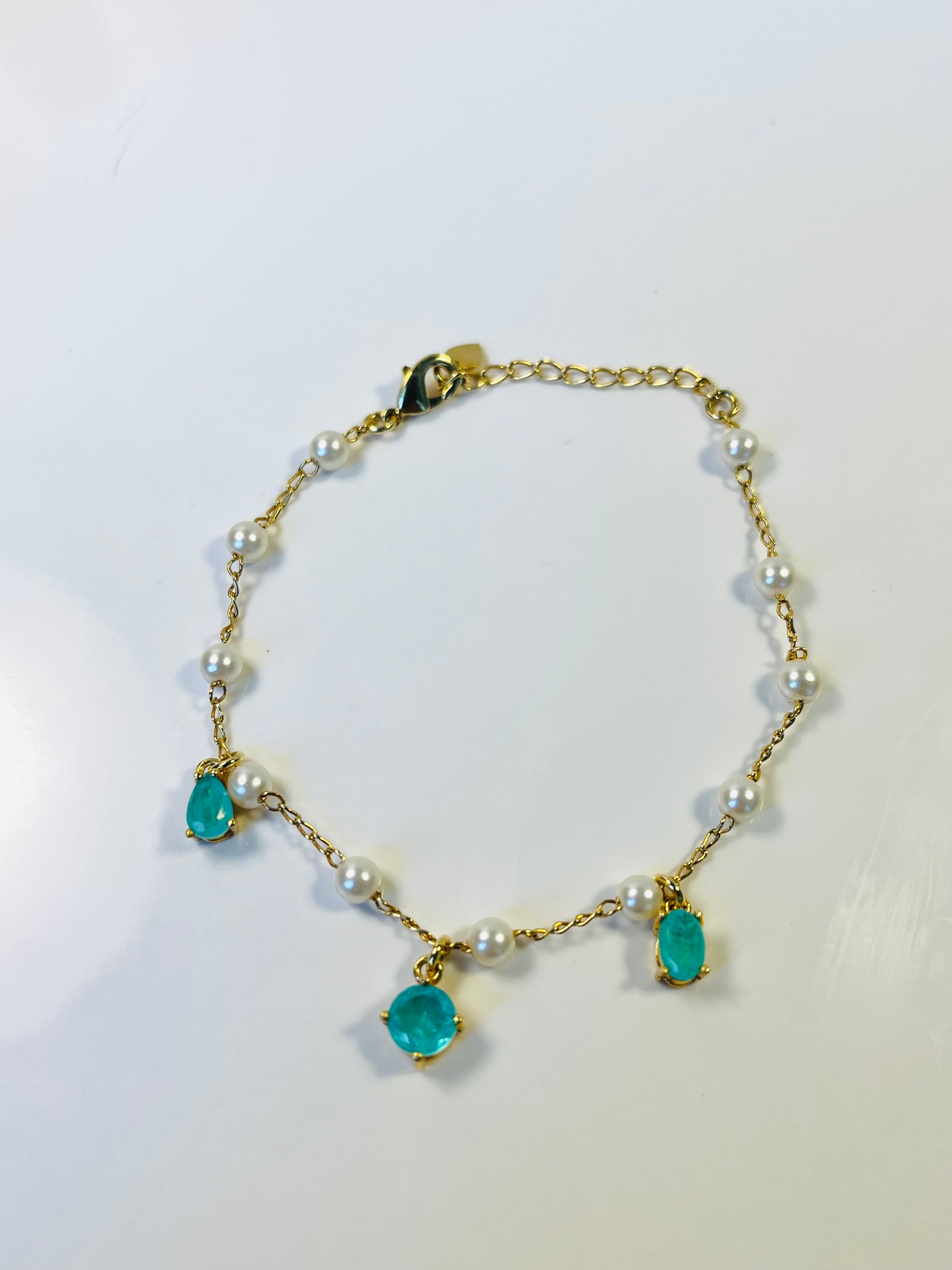 The Aquarella bracelet captures the essence of lightness and color. Featuring delicate pearls and aqua-blue stones on a fine gold-plated chain, it’s a perfect balance of elegance and charm.