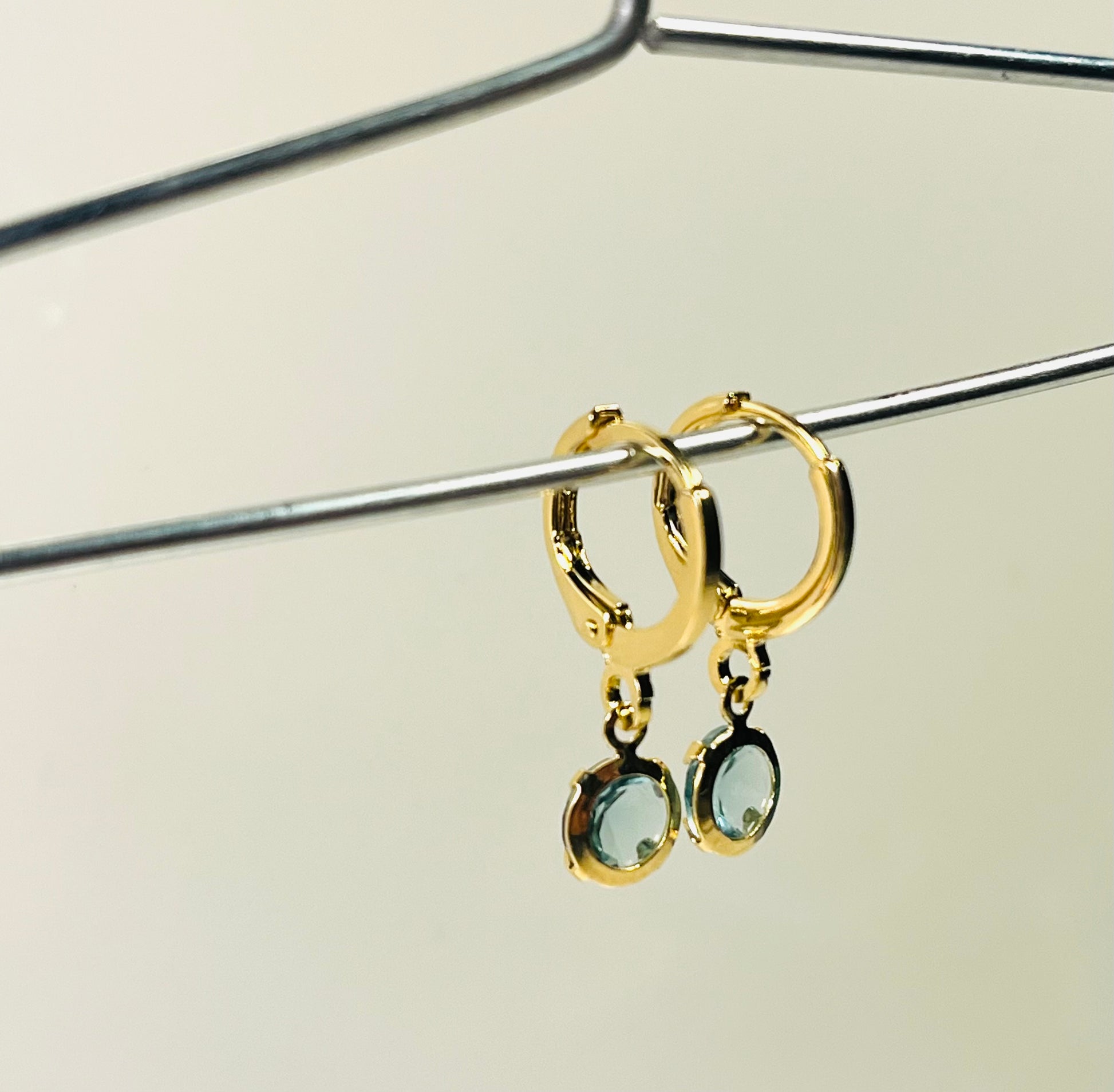 Elegant and airy, the Celeste hoops feature a soft green round-cut crystal that floats gently from sleek gold-plated mini hoops. Their subtle shimmer and refined silhouette make them a perfect everyday staple with a touch of charm.