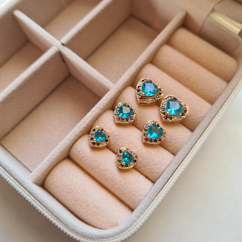 Delicate yet full of personality, the Cora earrings feature a small heart-shaped blue zirconia surrounded by a colorful halo of tiny rainbow stones. These gold-plated studs are designed to add a pop of joy and charm to your everyday look.