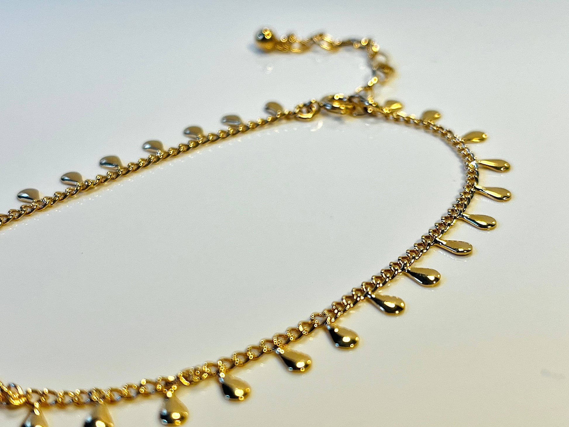 The Raia anklet brings effortless elegance to your every step. Featuring delicate gold-plated drops along a fine chain, this piece shimmers with subtle movement — perfect for both summer days and evening looks.